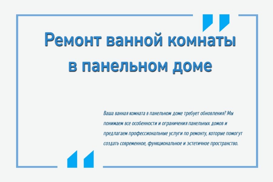 Ваша ванная комната в панельном доме требует обновления? Мы понимаем все особенности и ограничения панельных домов и предлагаем профессиональные услуги по ремонту, которые помогут создать современное, функциональное и эстетичное пространство.